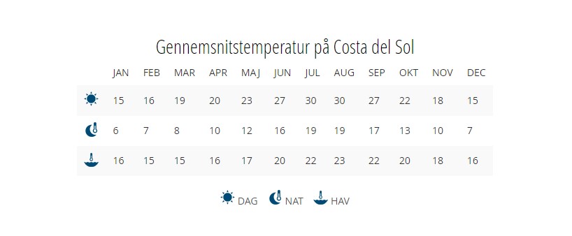 Vejret på Costa del Sol er blandt det bedste, I finder i Europa. Her skinner solen dagen lang, mens temperaturerne kravler opad på termometeret. At Costa del Sol betyder Solkysten er derfor fuldt berettiget – her er nemlig sol og sommer fra maj til oktober.